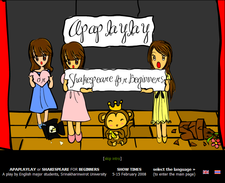 Project งานละครเวทีภาษาอังกฤษสมัยป.ตรีค่ะ อันนี้จะเป็นเว็บไซต์ เมื่อก่อนจะมีเว็บบอร์ดด้วย แต่เมื่อหมดงานก็เอาออกไปแล้วค่ะ สามารถดู intro ของเว็บได้ที่ https://www.youtube.com/watch?v=P2Zwfpe5kGU